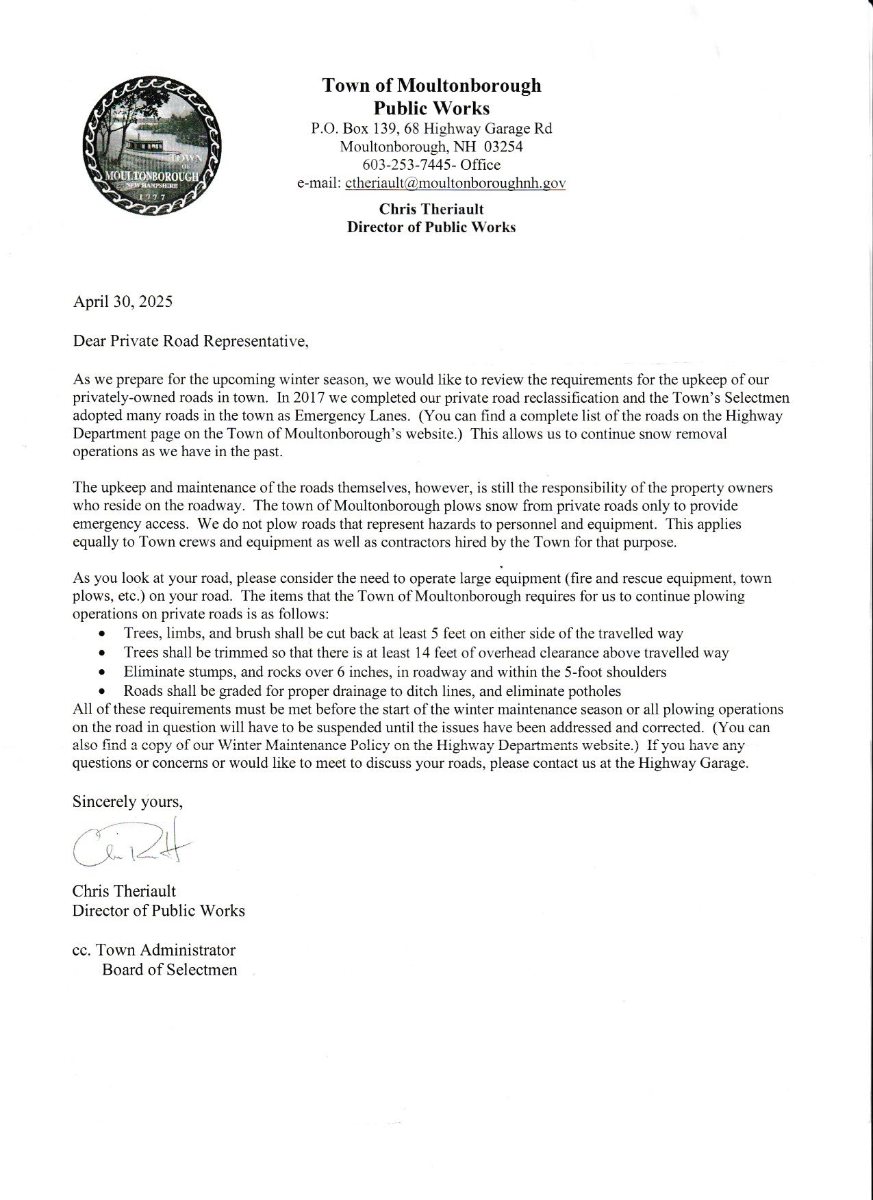 The file shown below is the April 30, 2025 letter from the Town of Moultonborough Public Works regarding the upkeep of our private roads in preparation for winter plowing. The NH Highway Department Winter Maintenance Policy is also provided as a reference.
